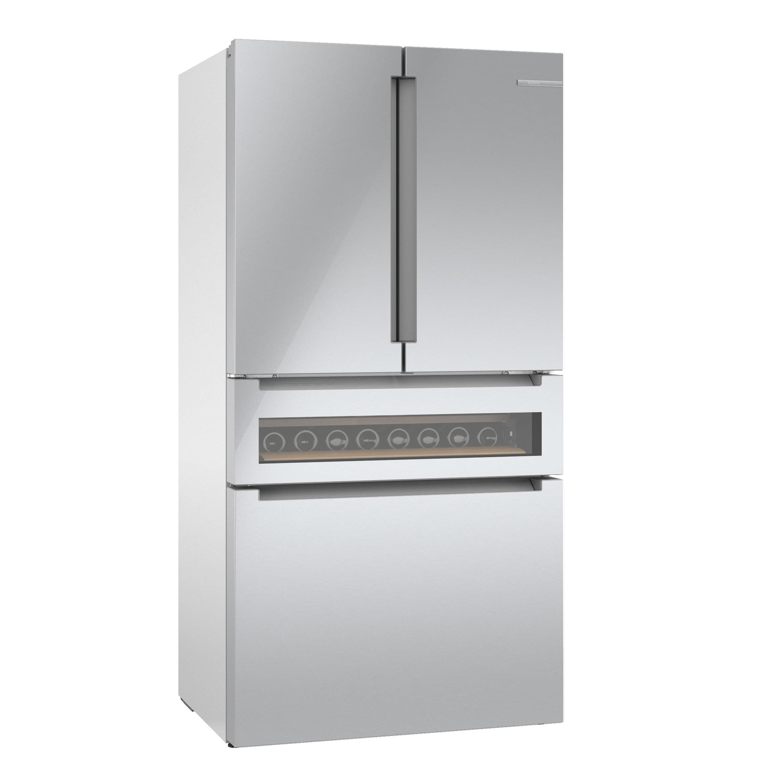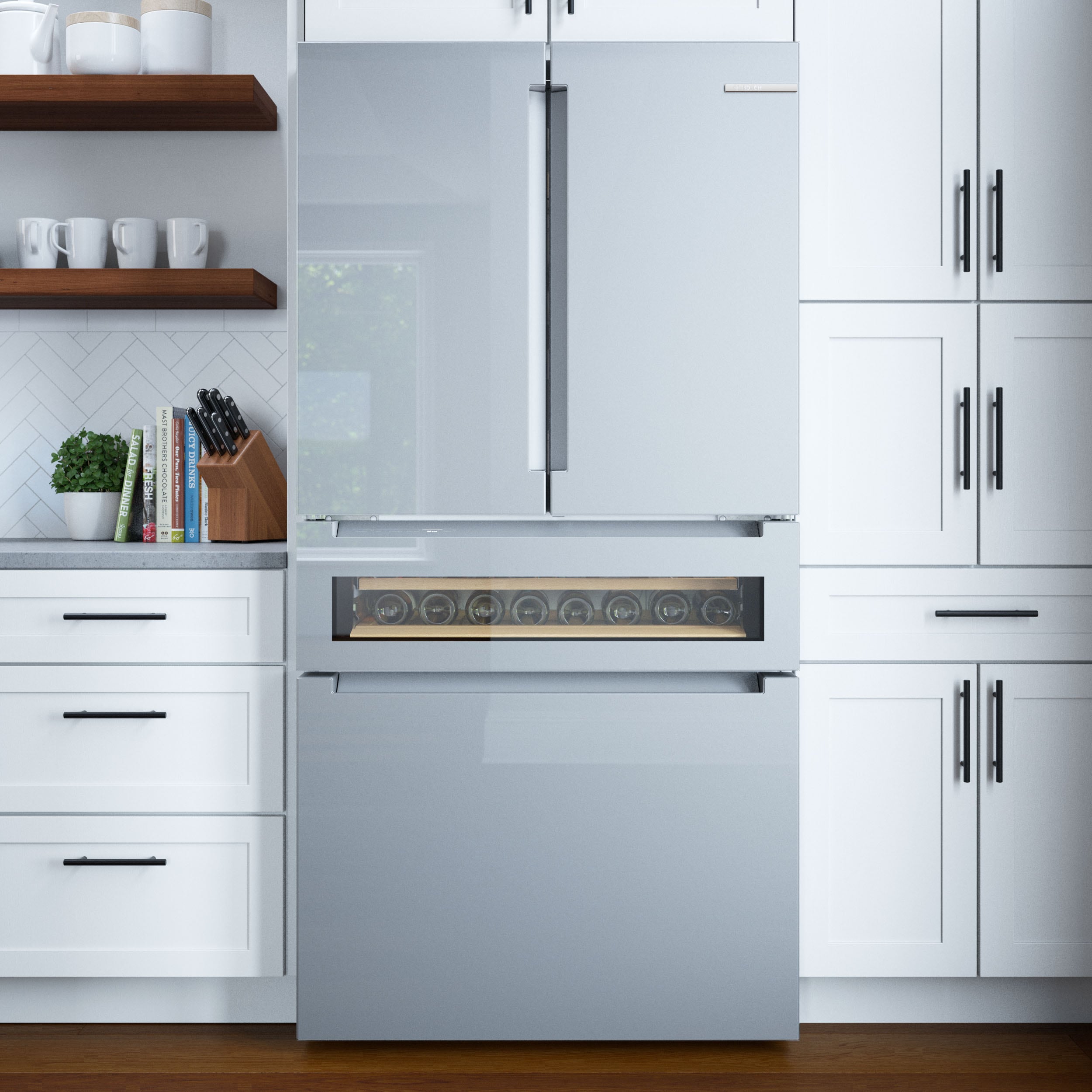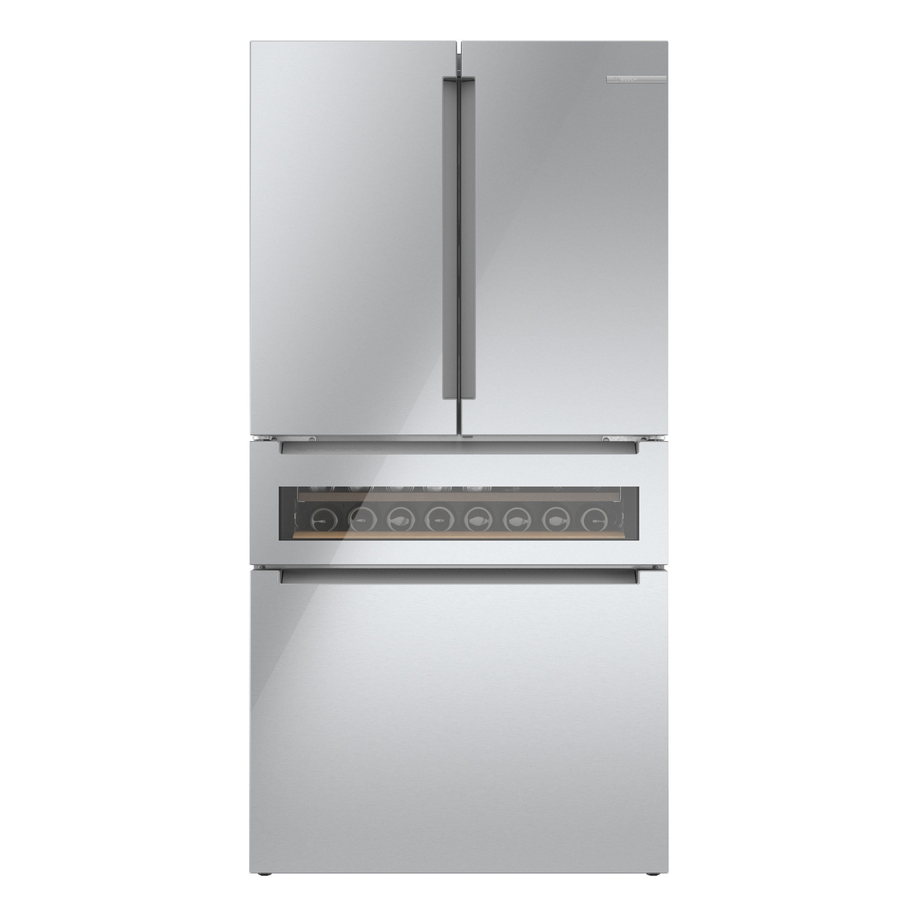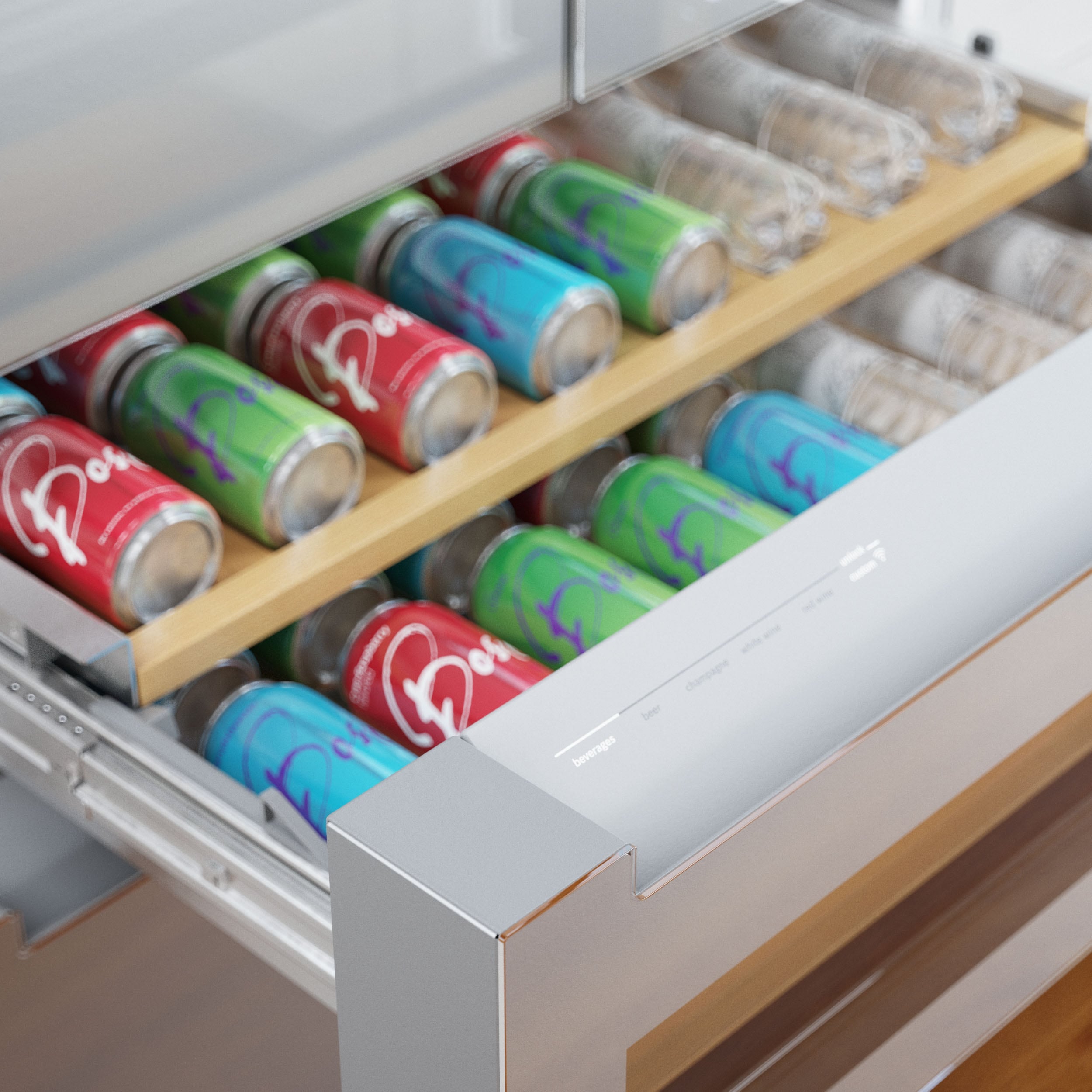 An ingenious three-tier layered freezer drawer system creates extra storage for frozen items, while the advanced ice maker creates pyramid-shaped ice that is fully accessible via a pull-out bin and ice scoop