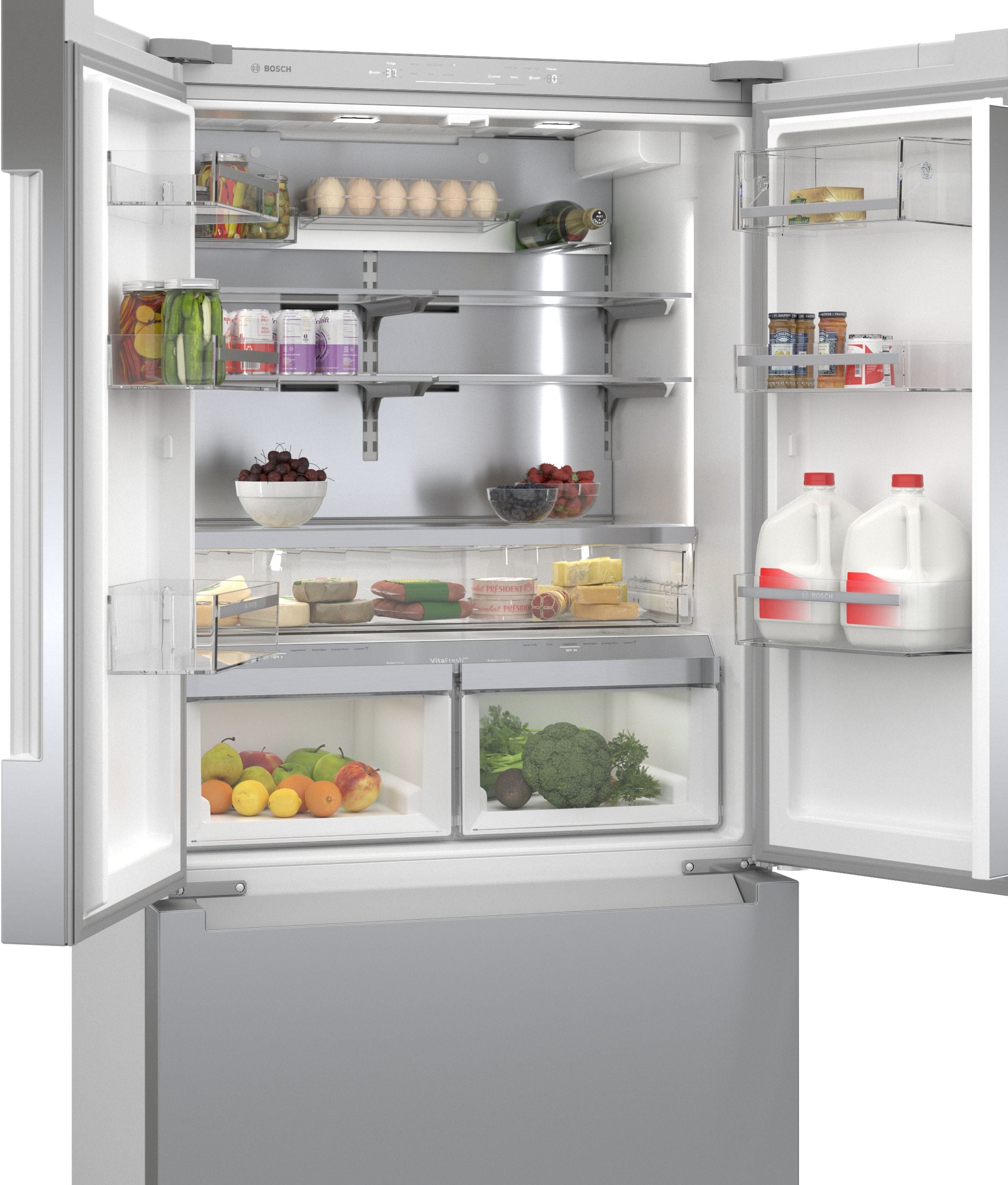 Introducing the revolutionary, Bosch counter-depth refrigerators, with a streamlined interior and advanced freshness system designed to keep the ingredients you love fresher longer. Enjoy less food waste, and more thoughtful design. Our revolutionary FarmFresh System combines four innovative technologies designed to take food preservation to the next level, while minimizing food waste. Working in harmony, the VitaFreshPro, FreshProtect Ethylene Filter, MultiAirFlow, and AirFresh Filter provide the optimal environment for your food storage needs. VitaFreshPro automatically balances BOTH temperature and humidity. From produce to meats to cheeses, pre-programmed settings calibrate the optimal environment, removing the guesswork from food storage. FreshProtect absorbs naturally occurring ethylene to slow ripening, so produce stays fresher, longer. MultiAirFlow and AirFreshFilter work together to keep the temperature consistent while reducing odors. It's refrigeration, reinvented.