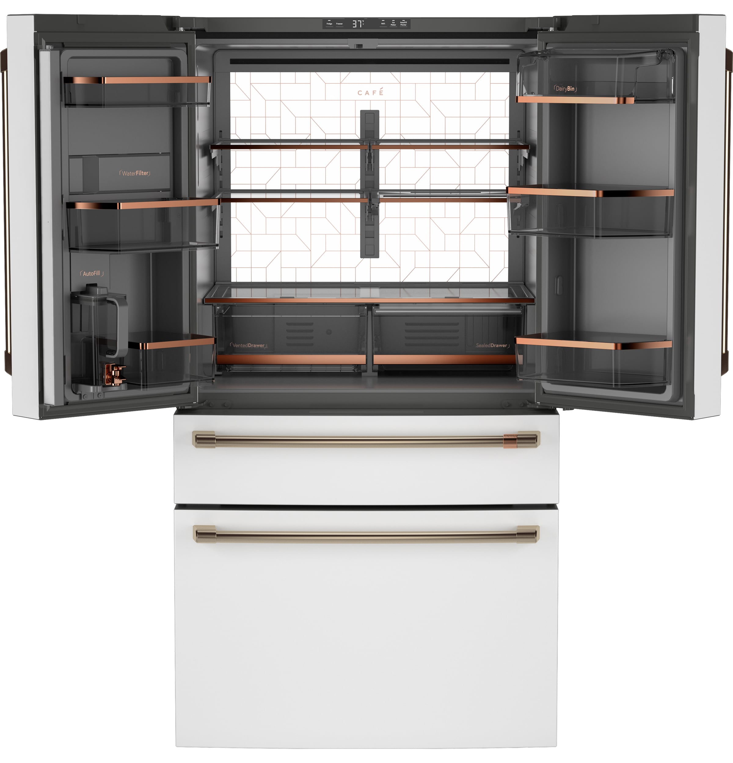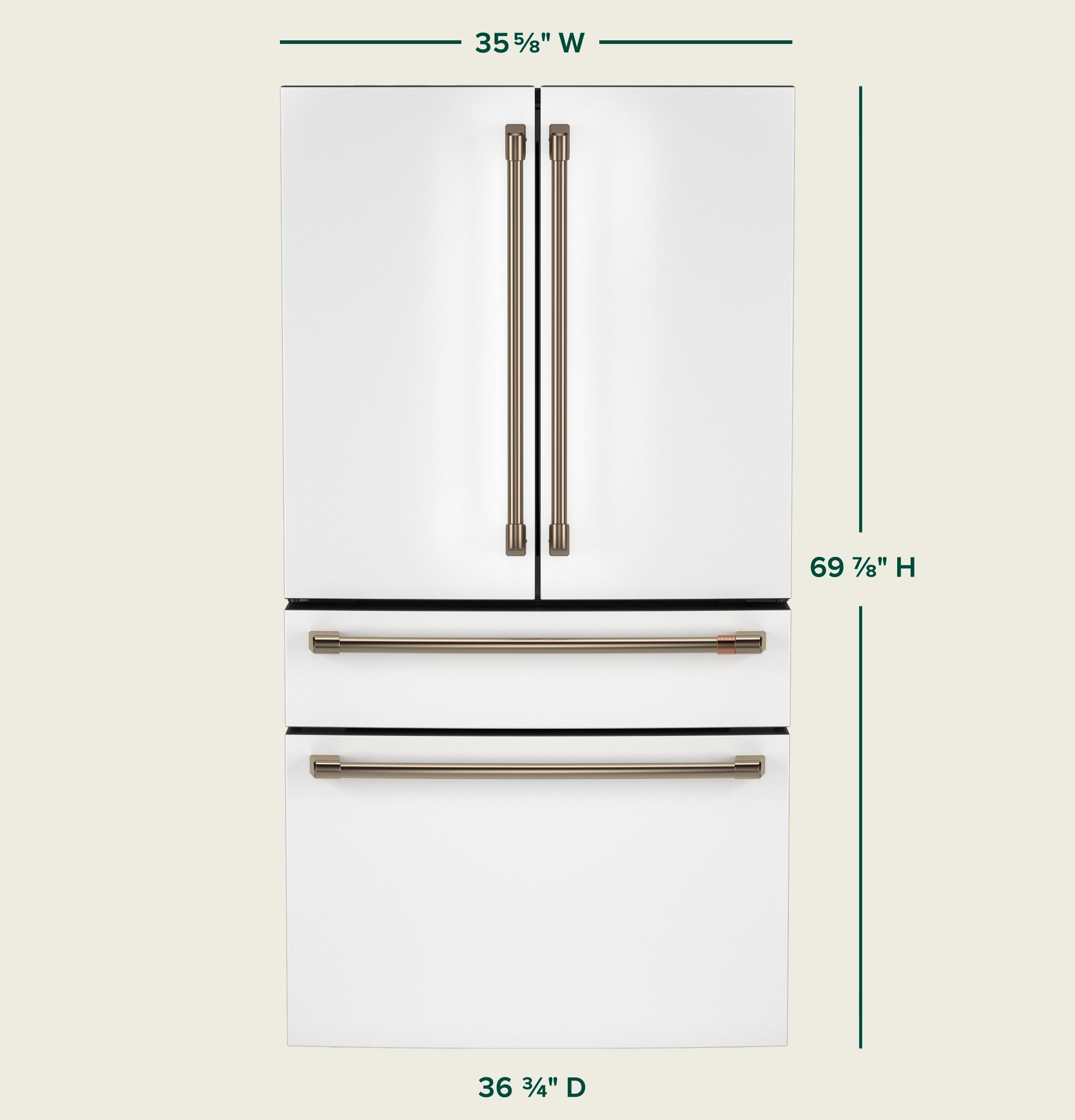 • Cafe Standard-Depth Matte White with Brushed Bronze Handles 28.7-cu ft 4 -Door Smart Compatible French Door Refrigerator with Ice Maker with Water Dispenser ( Matte White ) ENERGY STAR Certified