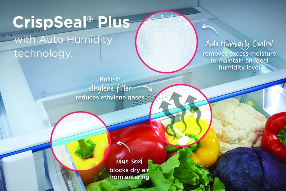 Crisper technology with filter and auto humidity: CrispSeal blocks out dry air and an added filter reduces gas that causes product to ripen faster.