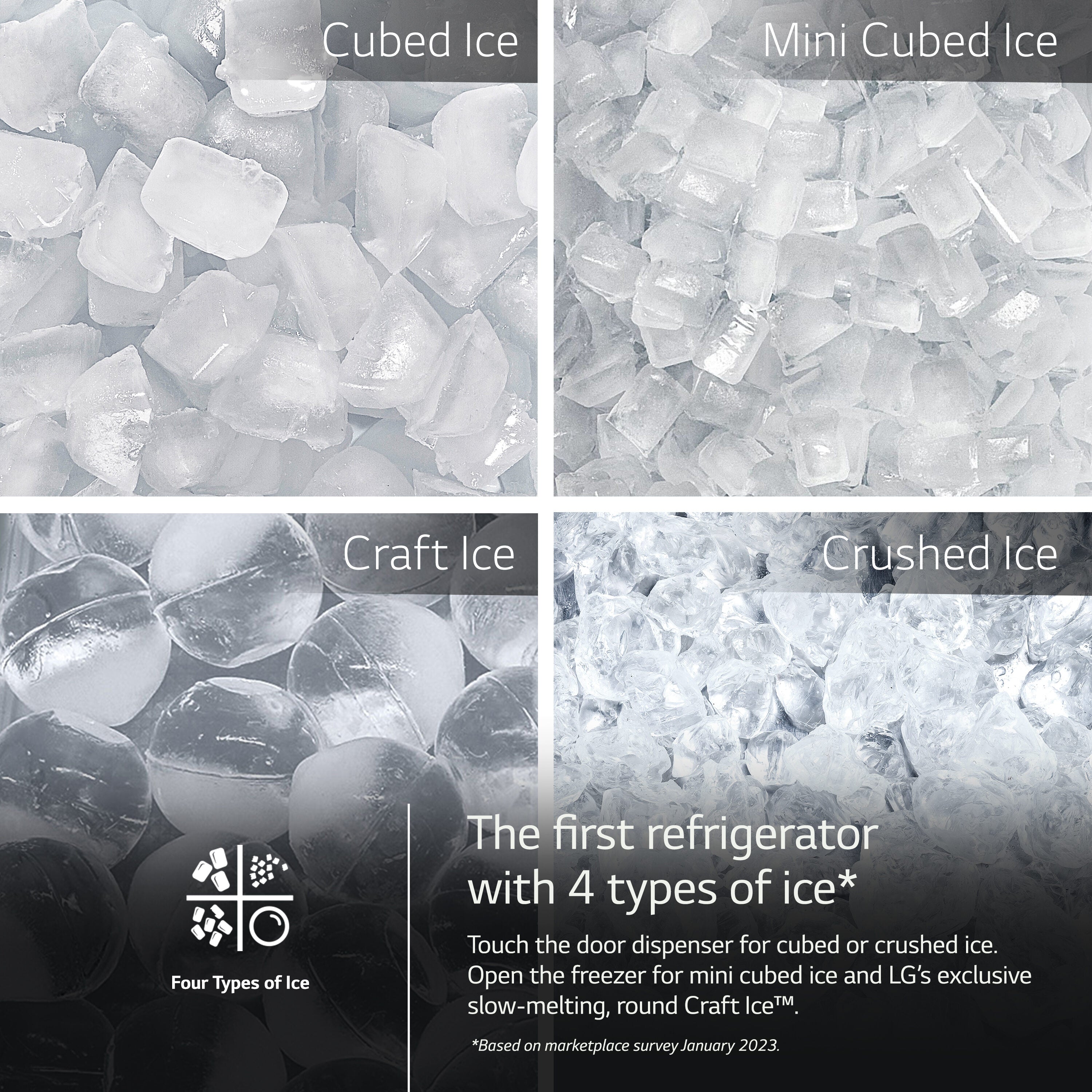 • From cubed and crushed to Craft Ice™ and NEW mini cubed, this LG refrigerator makes 4 types of ice that are perfect for every occasion.