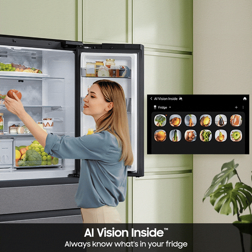 AI Vision Inside™: AI Vision Inside™ recognizes select items that you put in and and take out of your fridge, so you always know what's inside(AI Vision Inside™ can recognize and automatically label 37 unobscured fresh food items such as select fruits and vegetables; other items may be manually labeled; Results vary by manner of placement); Access a list of what's in your fridge through the SmartThings app(Wi-Fi connection and Samsung account required); or AI Home screen.