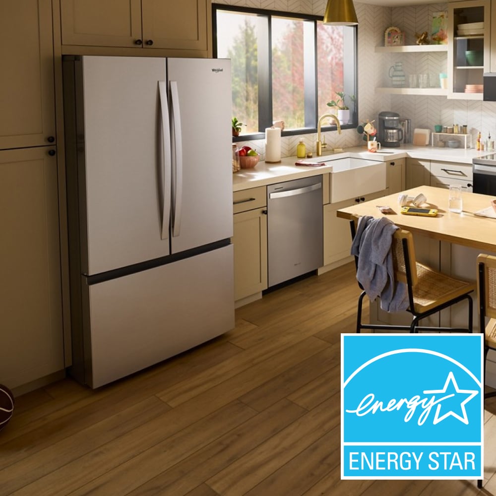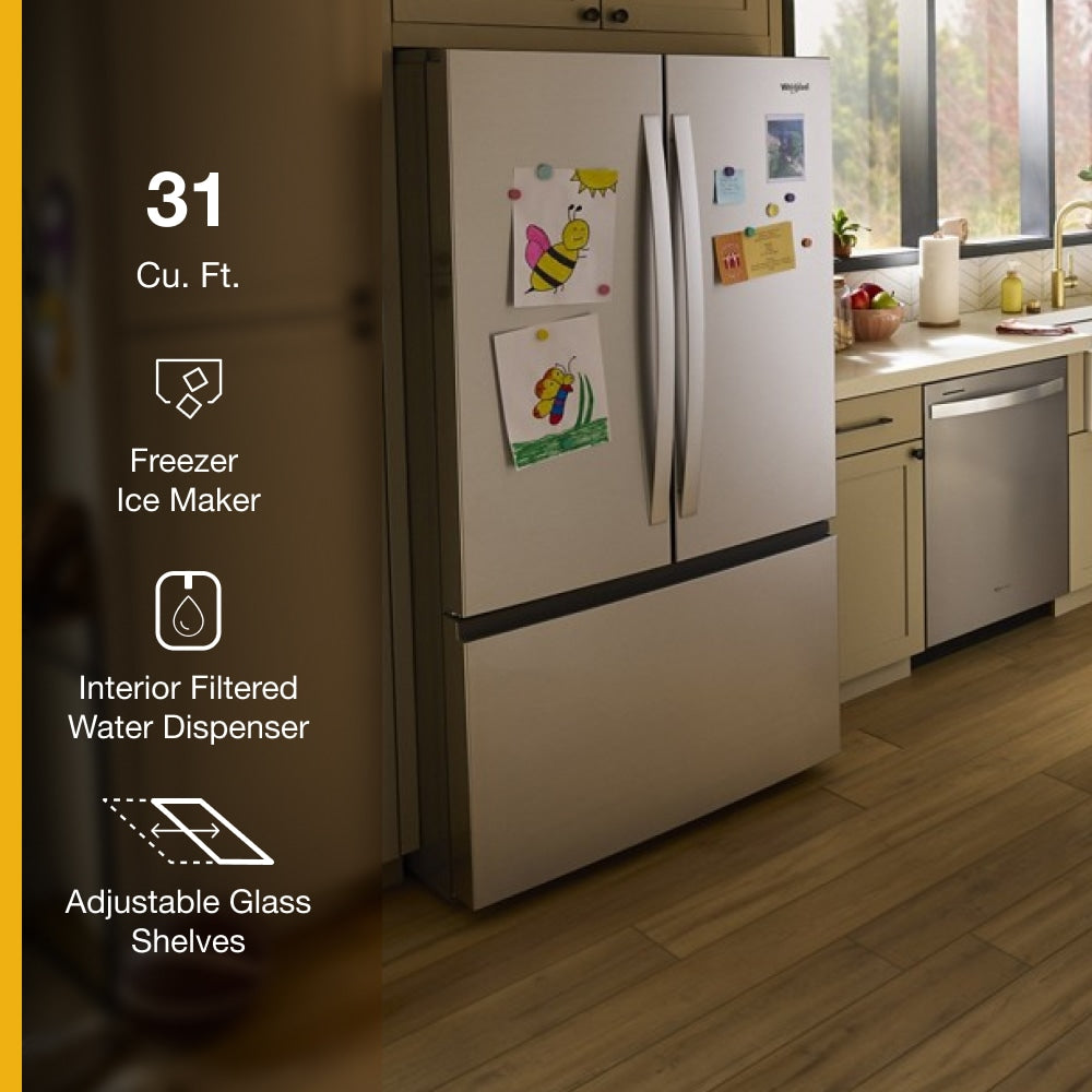 Get family-sized capacity, ice and flexible organization to keep up with whatever the day brings. This Whirlpool® French Door Refrigerator has makes over 3 lbs of ice every day. Fill up quick with the In-Door Filtered Water Dispenser & Ice Maker. Pint-Size Storage provides easy access to small items. And enjoy flexible storage with half and full Adjustable Glass Shelves. ENERGY STAR® certified.