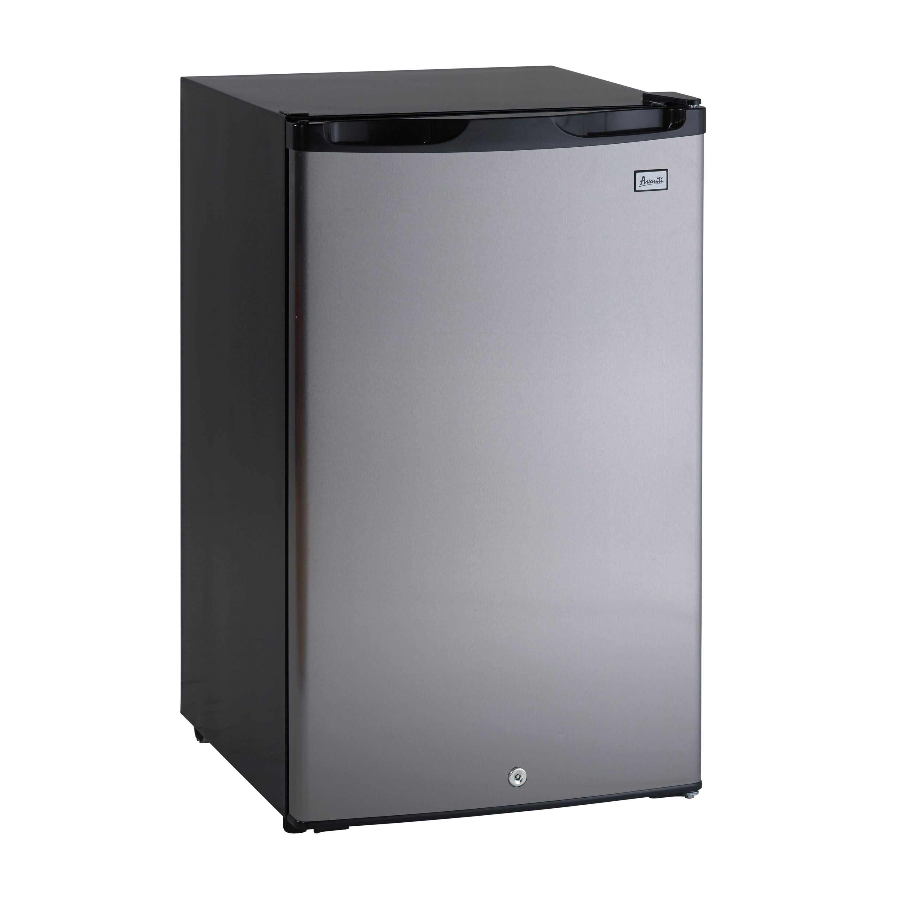 Keep your snacks and favorite beverages close by in the compact, 4.4 cubic foot refrigerator from Avanti. The perfect lockable mini fridge for the office, dorm, man cave, she shed, bar, bedroom, or anywhere you need a little extra refrigerator space. The door shelves can accommodate 2 liter and gallon bottles and six 12 ounce cans, as well as other drinks and condiments. Use the adjustable, removable glass shelving to arrange salads, fruits, snacks, and other foods for easy access throughout the day. This compact fridge features automatic defrost so your foods remain fresh and cold. Select the right settings for your items with the full range temperature control.