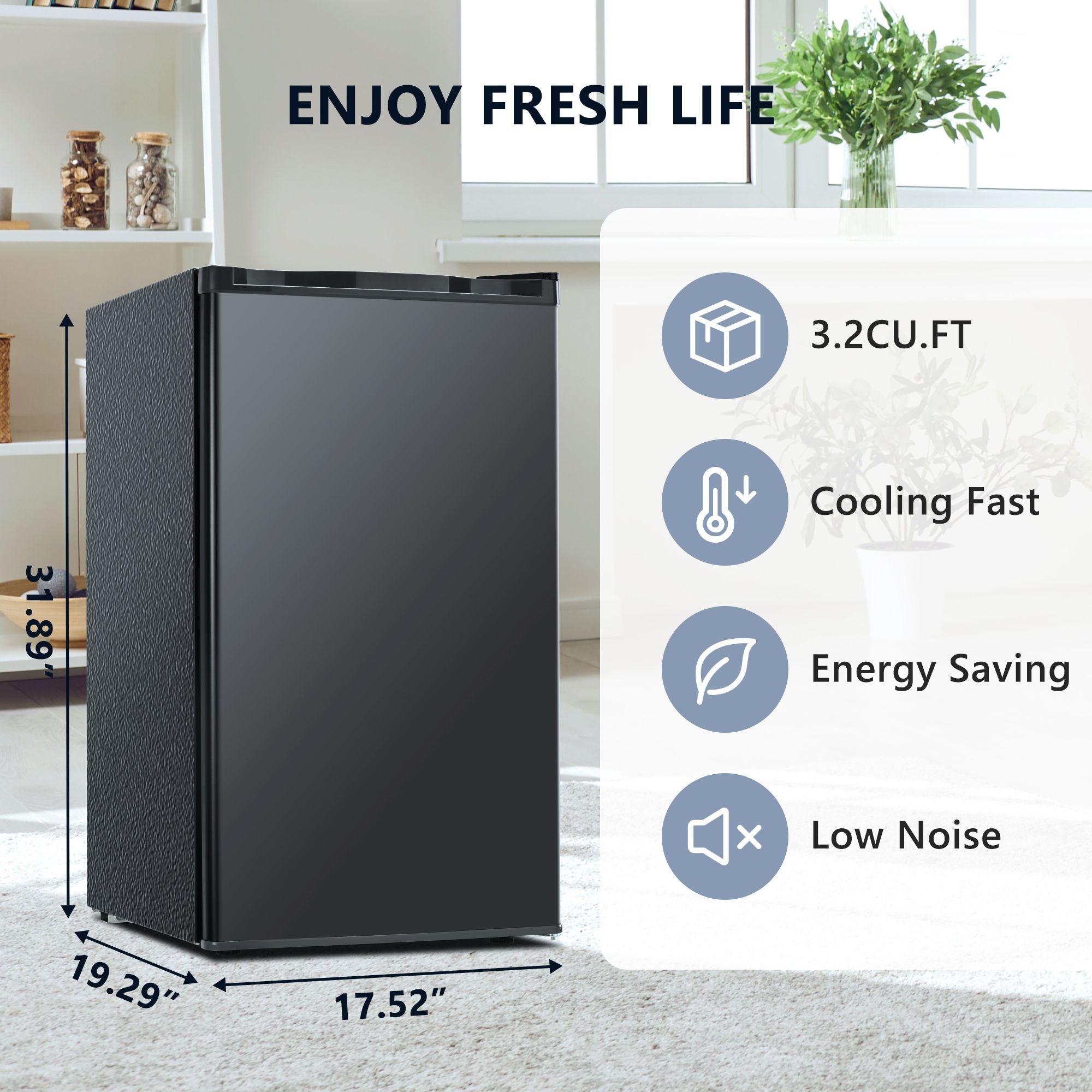 Introducing the Compact Refrigerator, the perfect solution for those seeking a stylish yet functional cooling option. With a generous capacity of 3.2 cu. ft. this refrigerator features an elegant stainless steel silver door and soft yellow interior lighting, making it easy to find your favorite snacks and beverages. Its dedicated fruit and vegetable box ensures your produce stays fresh and organized, promoting healthier eating habits. Measuring 18 in. W x 19 in. D x 32 in. H, this refrigerator is designed to fit seamlessly into any small space, whether it's a dorm room, office, or apartment. Weighing just 39 lb. it's lightweight and easy to move, making it an ideal choice for anyone looking to maximize their storage without sacrificing style. Upgrade your cooling experience with this compact appliance-where practicality meets modern design.