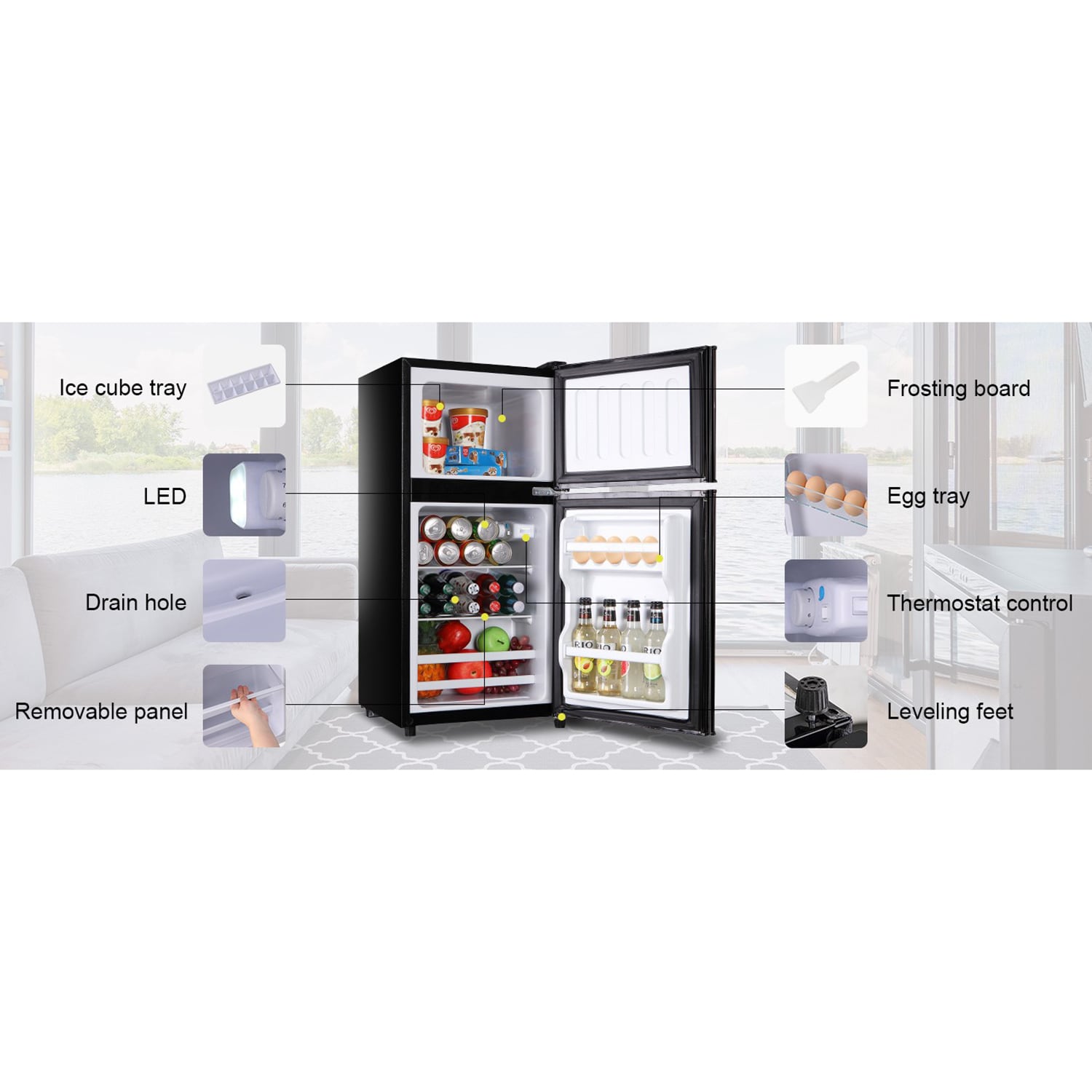 The large capacity of 3.5 Cu Ft is divided into refrigerator and freezer areas, which are more spacious than ordinary mini refrigerators and can keep food fresh or frozen