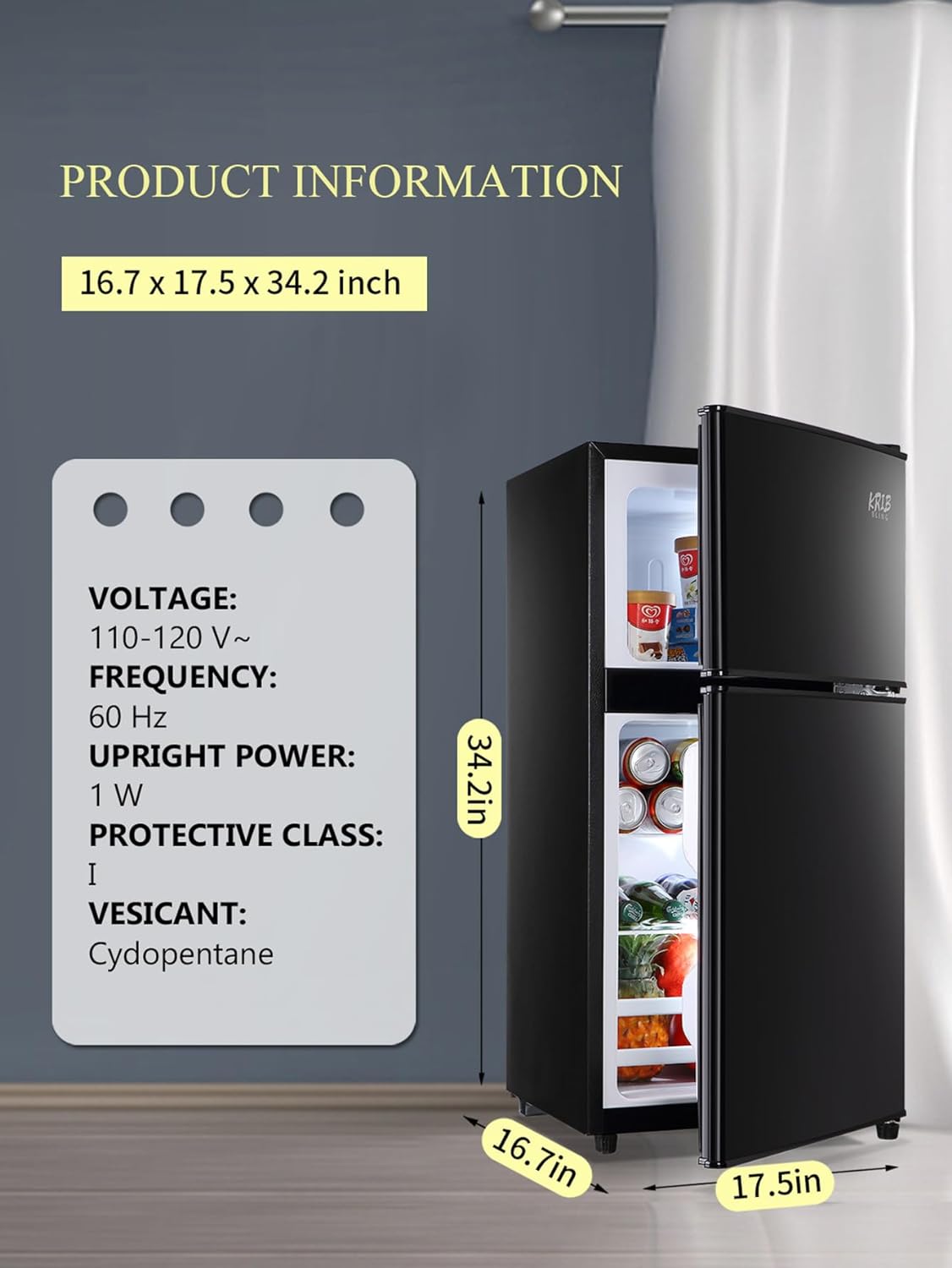 Two Door Design-the fridge has large 2.3 cu ft fresh food capacity for keeping foods organized and 1.2 cu ft freezer capacity for storing frozen foods