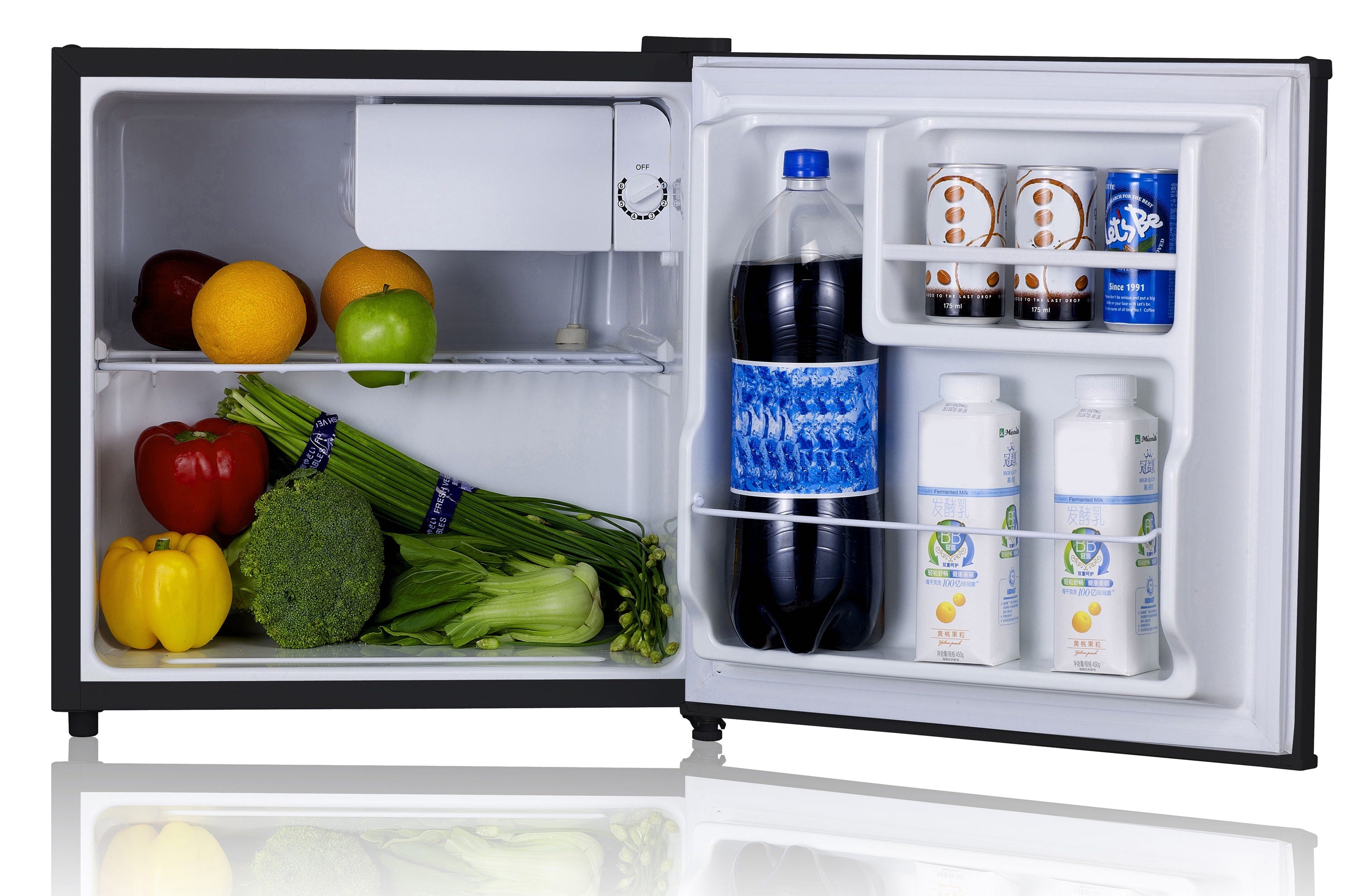 Flush back, compact design is ideal for college dorm room or office, perfect for counter-top placement. Reversible doors offer versatility. Features tall bottle door rack, removable shelf and adjustable thermostat.