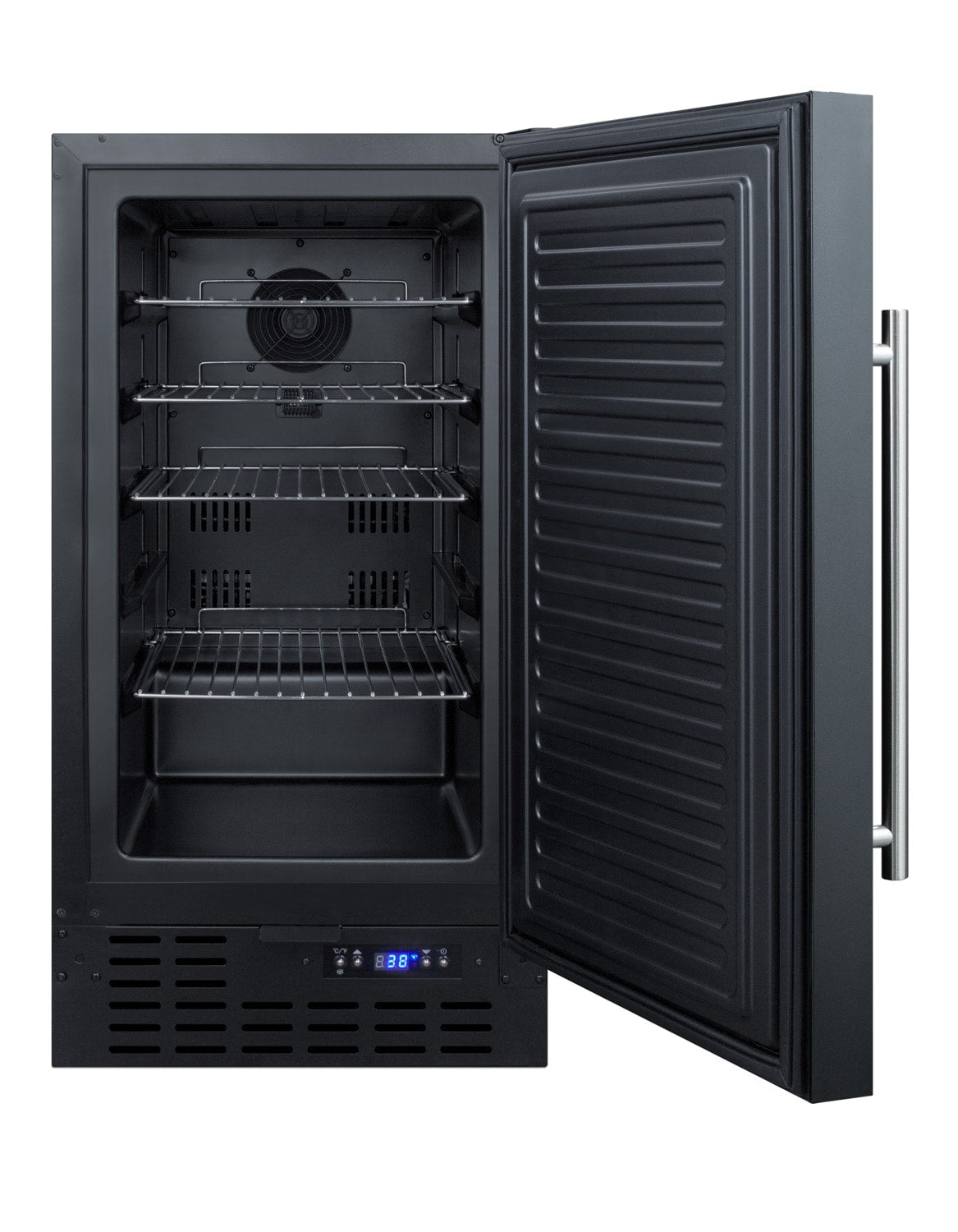 SUMMIT's selection of built-in undercounter refrigeration includes a complete 18" wide line for the home.Sized just under 18" wide, the FF1843B is the perfect all-refrigerator for space-challenged kitchens. It comes in a jet black finish and can be used built-in or freestanding. The user-reversible door includes a factory installed front lock. Inside, the FF1843B utilizes automatic defrost operation for low maintenance use. Four adjustable chrome shelves accommodate a variety of sizes and LED lighting offers an efficient interior view. This unit includes a digital thermostat for optimum temperature management.
