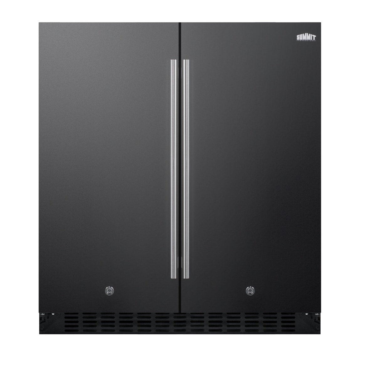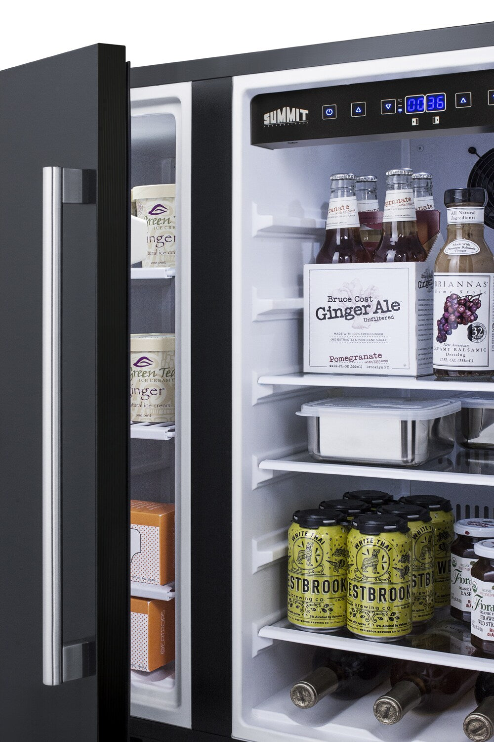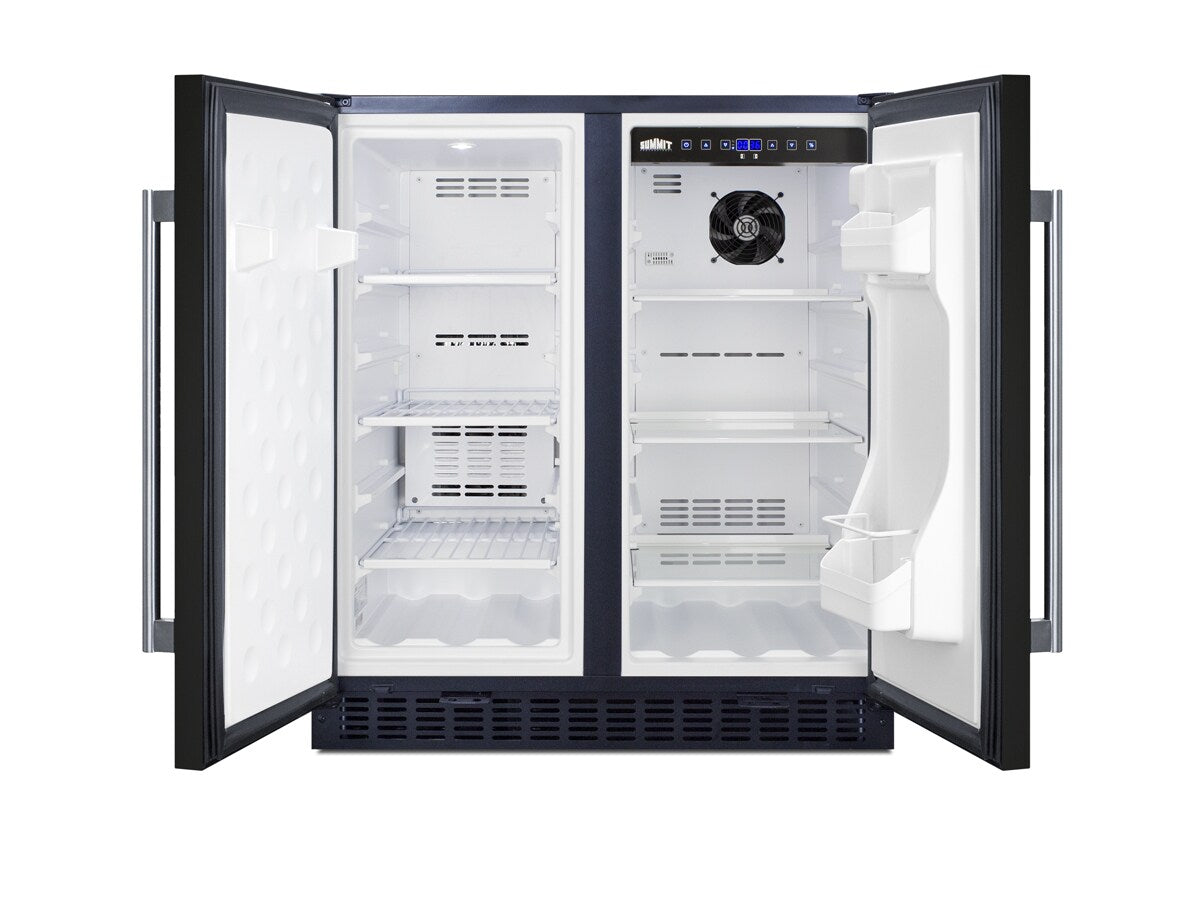 SUMMIT brings quality and value under the counter with a large collection of built-in refrigeration. Sized at 30" wide, the FFRF3070B is an all-in-one side-by-side refrigerator-freezer. The front breathing design allows built-in installation under counters, while the fully finished cabinet also enables freestanding use. This unit features a jet black exterior with stainless steel handles. Each compartment has a factory installed front lock for added security. The sealed back ensures easier cleanup with added space savings. Inside, the FFRF3070B features a 2.4 cu.ft. frost-free freezer compartment on the left and a 3 cu.ft. frost-free refrigerator compartment on the right. The refrigerator includes a digital thermostat allowing users to manage the temperature in each compartment, with a readout in Celsius or Fahrenheit for added convenience. Adjustable glass shelves offer cleaner spill-proof storage for fresh food items, while two removable door shelves provide additional storage space as needed. An internal fan assures the compartment is cooled evenly from top to bottom. The freezer compartment includes adjustable wire shelves to ensure proper cold air circulation. Both sides feature LED lighting to provide an attractive, energy efficient presentation. The slotted floor design is ideal for keeping bottles safely in place. Additional features include an open door alarm, high temperature alarm, and Sabbath mode setting that allows you to disable certain functions during religious observance. With its innovative all-in-one design, user-friendly features, and full frost-free operation, the FFRF3070B is a great choice for smaller kitchens looking to maximize storage space under the counter.