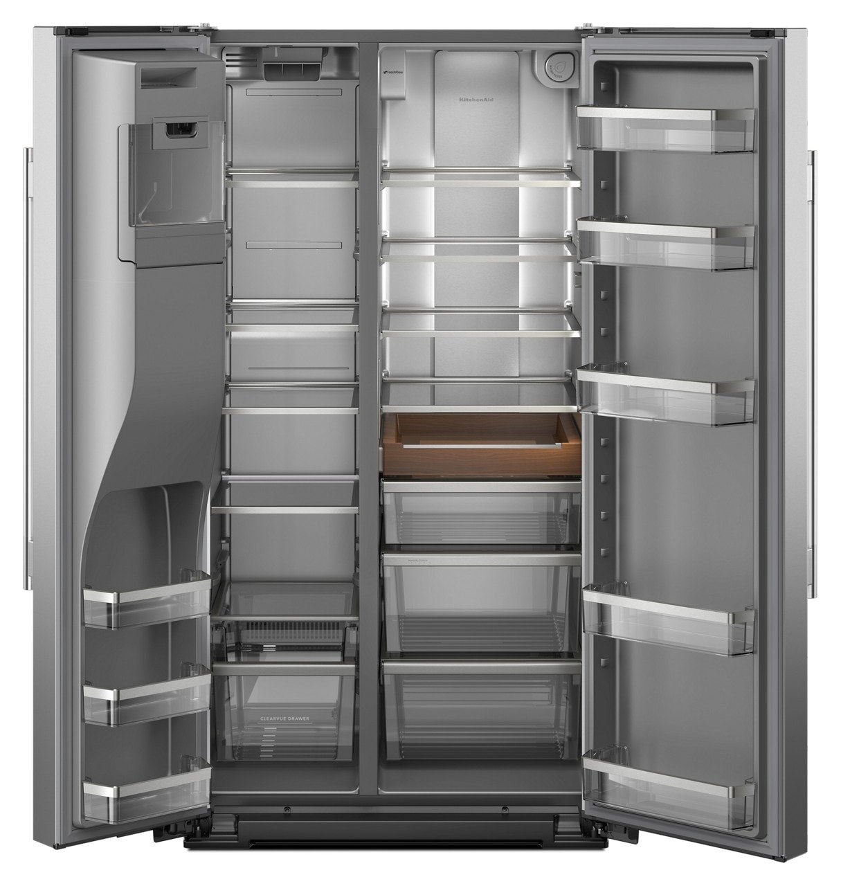 Make room for every grocery run and farmers market haul. This large capacity KitchenAid® side-by-side refrigerator has a Counter-Depth Design that fits with surrounding cabinetry to create a built-in appearance. The Signature Platinum Interior with Panoramic LED Lighting showcases your ingredients across nine removable shelves. And the Exterior Ice and Water Dispenser with Measured Fill allows you to select and dispense the exact amount you need in ounces, cups or liters.