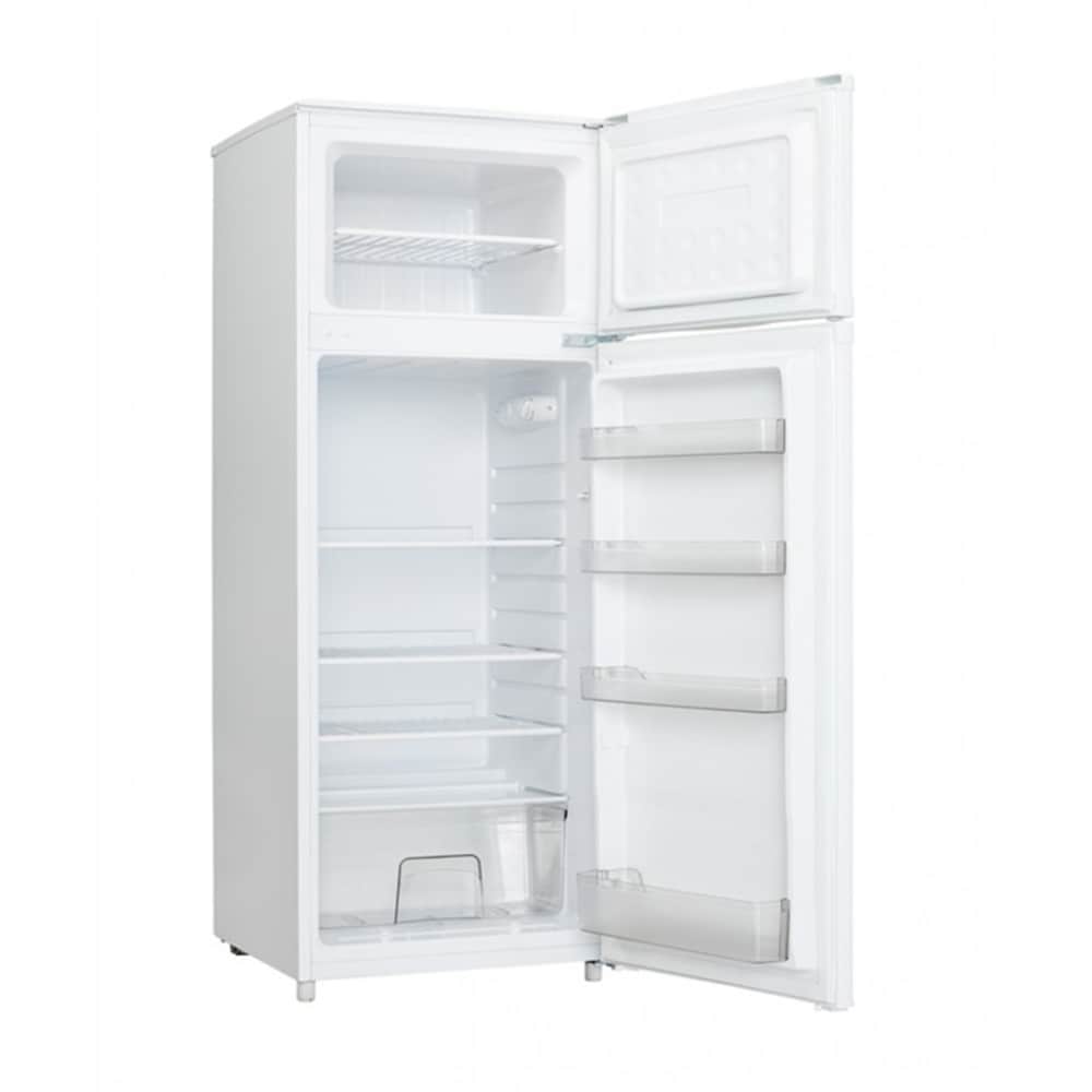 This top freezer apartment-size refrigerator by Bevoi is a great fit in the kitchen. The refrigerator features 7.3 cu. Ft. Total capacity, large crisper drawer, gallon bins, glass shelving.