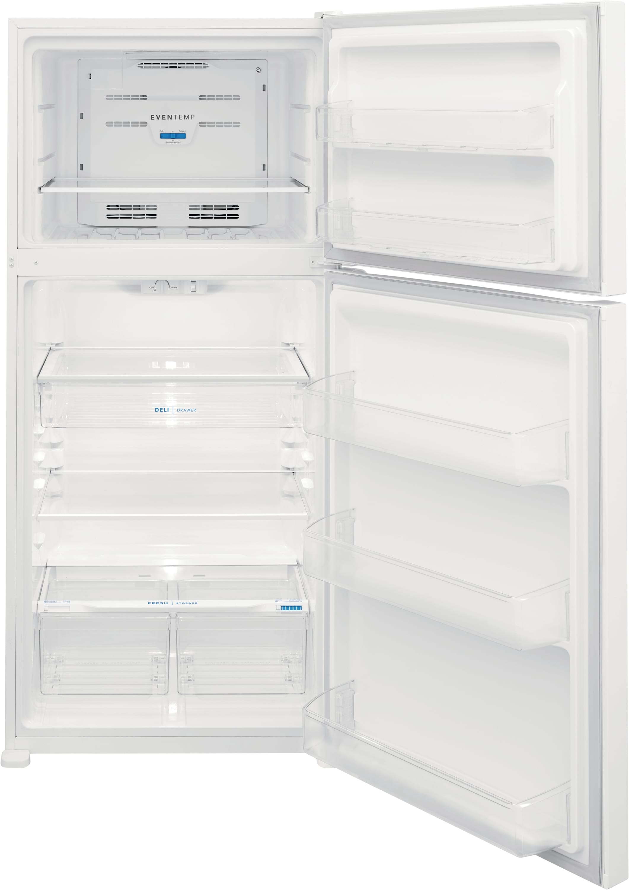 Spacious interior storage including a deli drawer, large door bins, and a glass freezer shelf