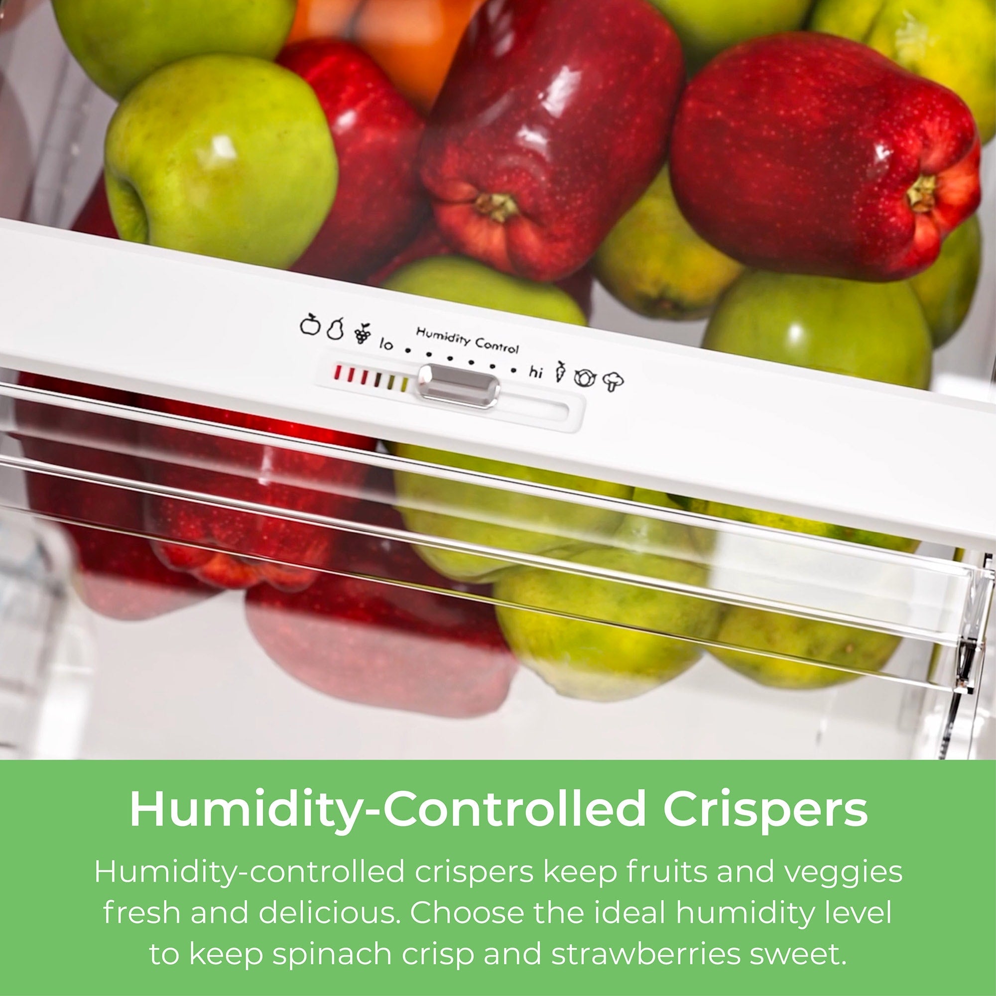 Clear humidity-controlled crisper drawers keep fruits and veggies fresh