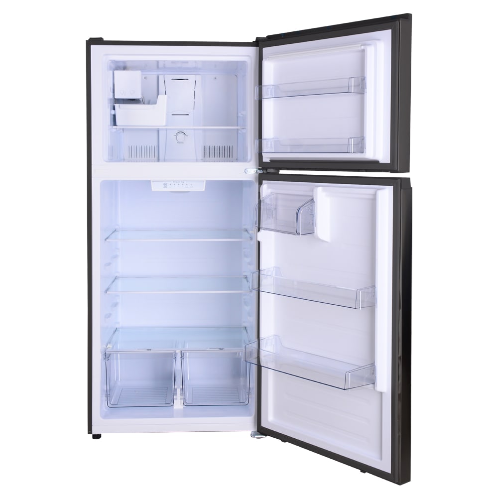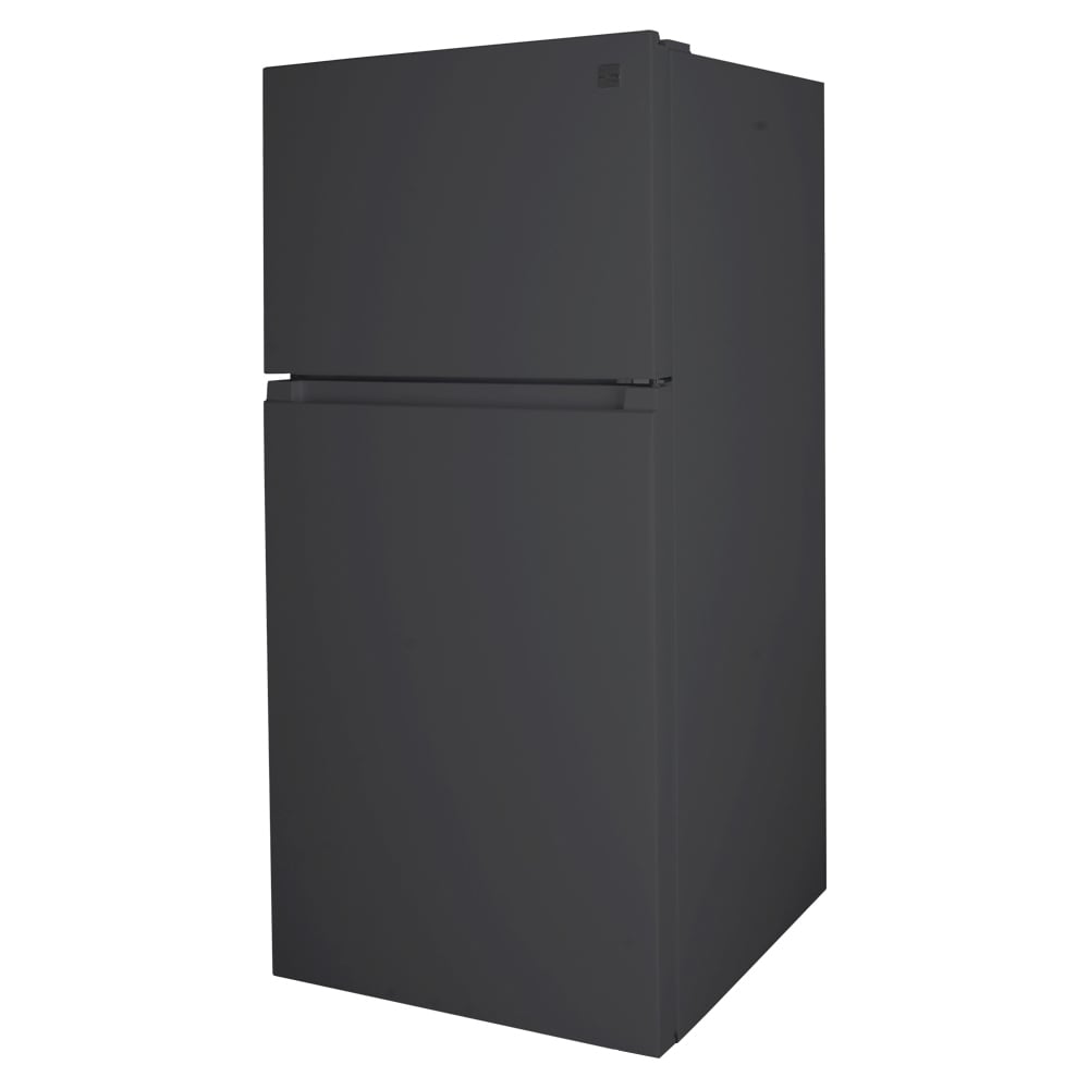 This Kenmore large black refrigerator and freezer has plenty of space to store your food and drinks, in style. This fridge has 18.1 cu. ft. of storage space, all in a 30-in wide footprint, saving space in your kitchen. Don't worry, though, as this fridge with freezer is still the traditional standard-depth design! This refrigerator for your apartment or home comes with a factory installed icemaker that produces up to 4 lbs. of crescent shaped ice per day. With a sleek, stylish construction and three different finish options, this black appliance is sure to fit in to any decor scheme. It features adjustable, full-width glass shelves, so you can customize your fridge to fit taller bottles and make the most of your space. The clear humidity controlled crisper lets you choose the ideal humidity level to keep your fruits and vegetables fresh, while the clear dairy compartment can store all your butters and spreads at their ideal temperature. Both the refrigerator and the top freezer have clear door bins, 3 in the fridge that can store a gallon of milk and 2 in the freezer to help you keep things organized and easily accessible. And don't worry about the energy bill, because this LED lighting refrigerator is ENERGY STAR® Certified, keeping energy use reasonable and costs low. The whole refrigerator freezer unit finishes with an elegant pocket style handle, recessed for a sleek flush-front design. Truly, it's the perfect multifunctional fridge and freezer set for any home!