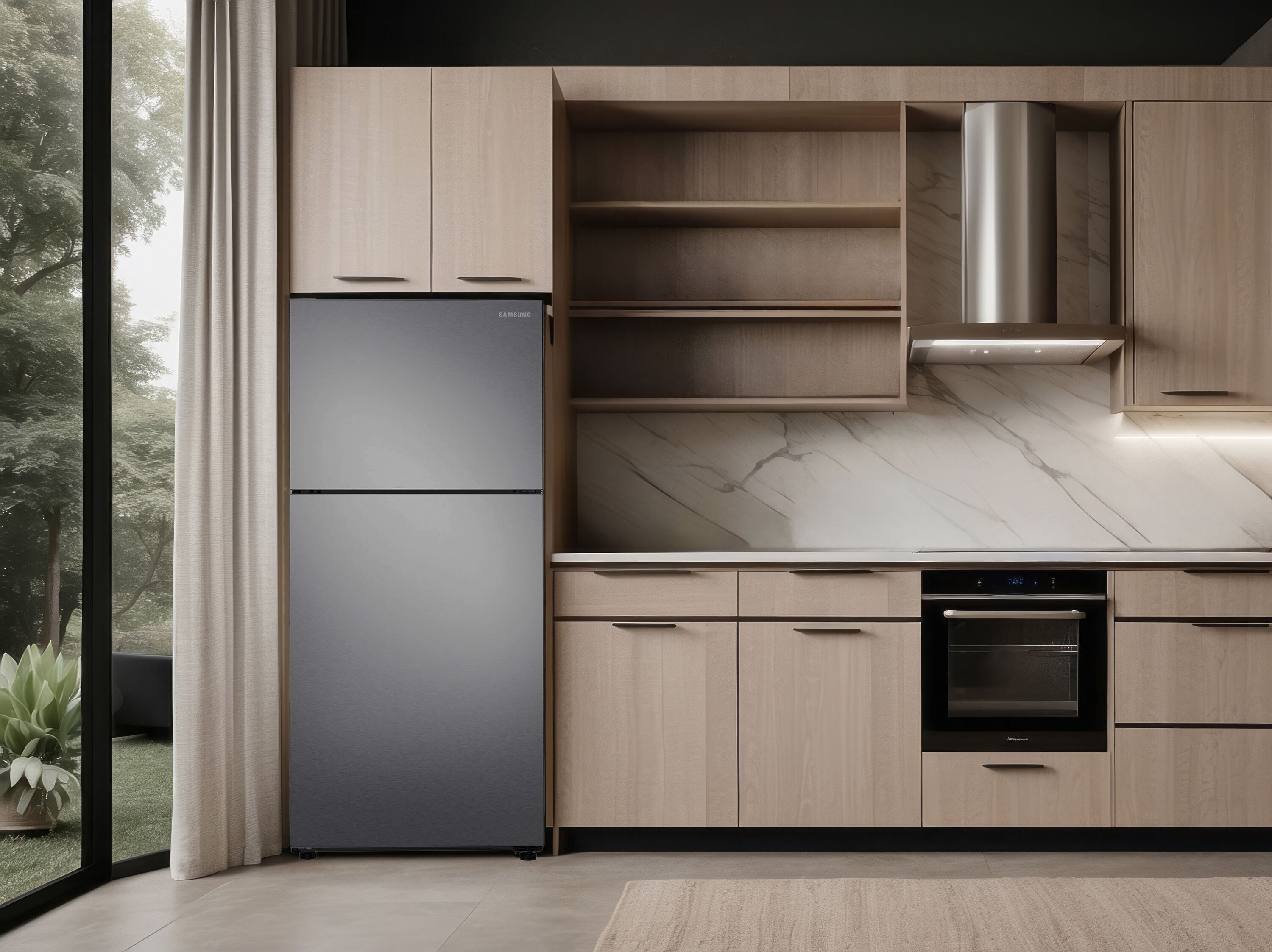 Modern Design: A modern look, featuring a minimalist exterior with signature flat door design and recessed handles, that seamlessly blends into your kitchen