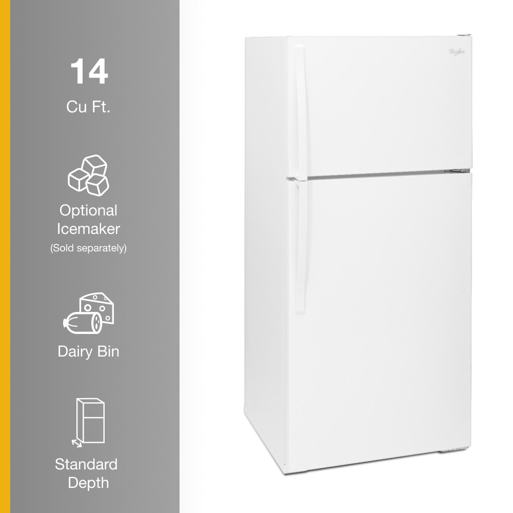 The storage flexibility your family needs. This Whirlpool® Top Freezer Refrigerator is designed with purposeful spaces and a 14 cu. ft. capacity to hold more of your favorites. Plus, you can purchase an Optional Icemaker so there’s no need to refill ice trays.