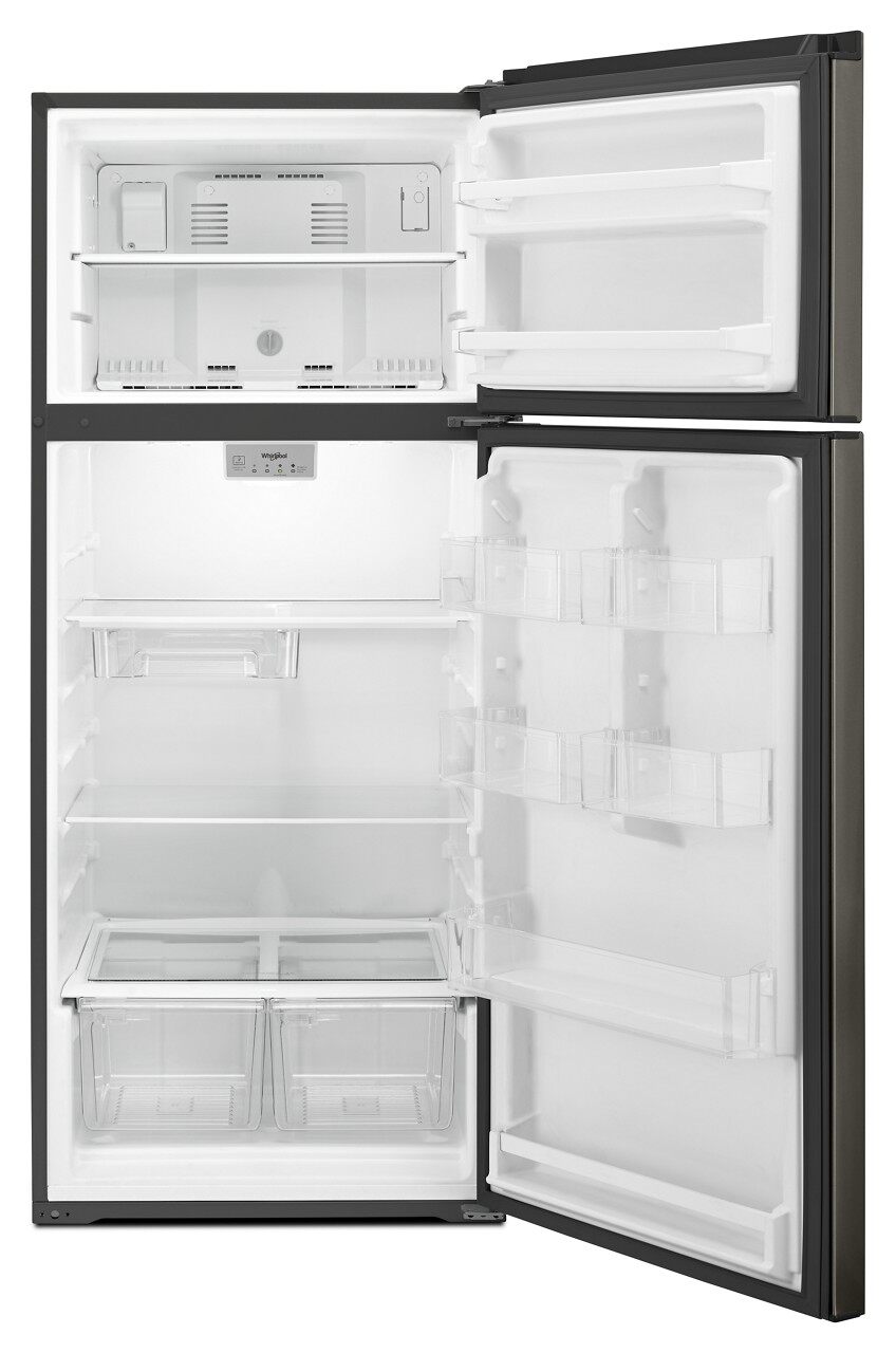 There's always a place for fresh and frozen favorites inside our Whirlpool® refrigerator. This 28" top-freezer refrigerator offers 18 cu. ft. capacity with more convenient storage options thanks to the Flexi-Slide™ bin that adjusts to make space for tall items. Bright LED interior lighting casts a more natural light on the contents of your black stainless finish top-freezer refrigerator so food looks as it should. Plus, you can easily access ice by adding the Whirlpool® EZ Connect icemaker kit.