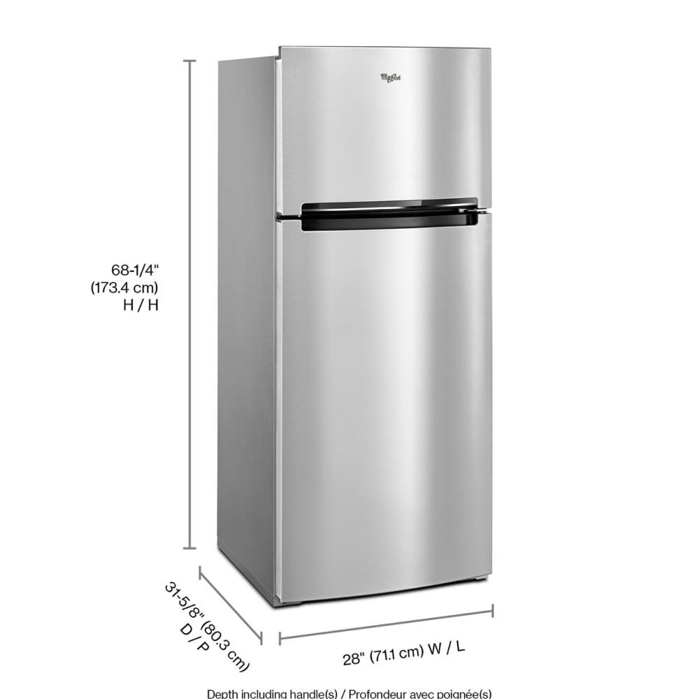 Sleek design, purposeful features. This Whirlpool® 18 cu ft top-freezer refrigerator has a pocket handle that gives it a seamless appearance. The thoughtful design extends to the interior as well, with a family-friendly capacity and storage features like a Flexi Slide-Bin™ that moves to accommodate larger items, and side door bins that make it easy to store (and find) beverages and condiments.