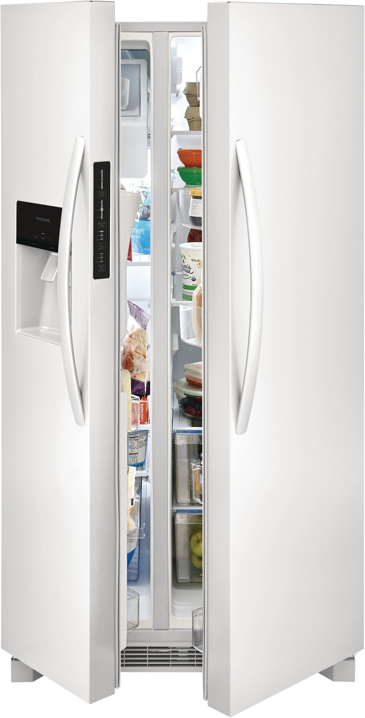 This Frigidaire 36-in side-by-side refrigerator offers our EvenTemp™ Cooling System which reacts quickly to temperature fluctuations and constantly circulates cold air throughout the fresh food and freezer compartments, ensuring a consistent cool from top to bottom. Keep fruits and vegetables fresh in our crispers that offer a seal to block out dry air. Enjoy the capacity to fit all of your family's favorites and keep everything tidy with our flexible organization system that includes adjustable gallon door bins, removable glass shelves and two produce drawers. Awarded the Best Overall Side by Side Refrigerator of 2023 by Reviewed.com (USA Today).